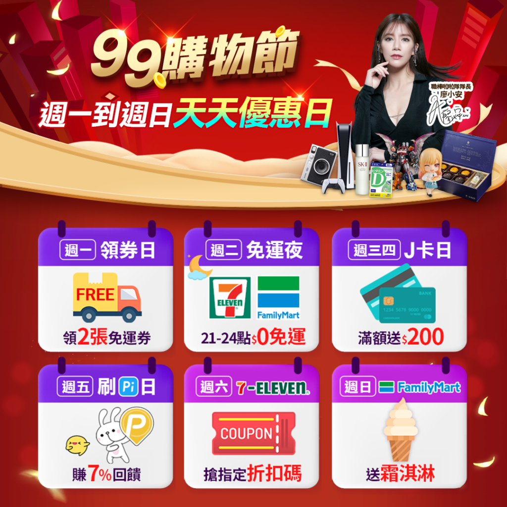 - 星期一領券日:人人皆可領19張免運券,週一再加碼2張