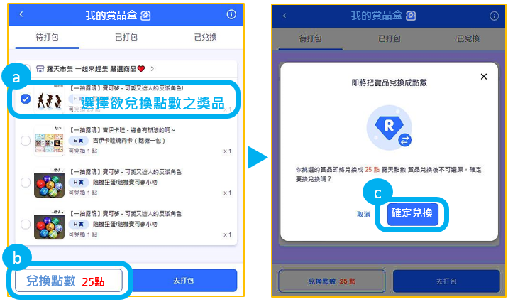 於我的賞品盒中「待打包」頁面中,請勾選你欲兌換點數之獎品,點下方「兌換點數」,顯示彈跳確認視窗再次點選「確認兌換」送出即完成兌換。