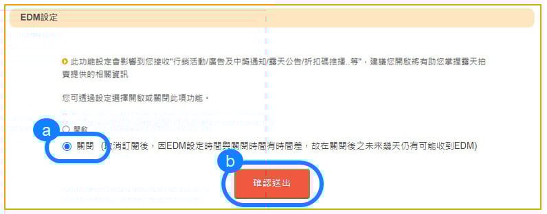 點選進入【前往取消訂閱電子報】,出現EDM設定頁面後,請先勾選「關閉」選項再點選下方【確認送出】即可。