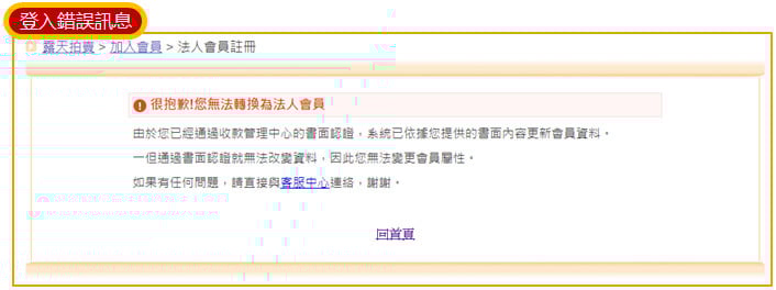 ※若點選轉為法人會員後顯示以下錯誤訊息,表示您已完成郵局帳戶(原超商)書面認證,無法自行網頁申請個人轉法人,需聯絡露天客服協助,相關申請流程請參考此連結說明。