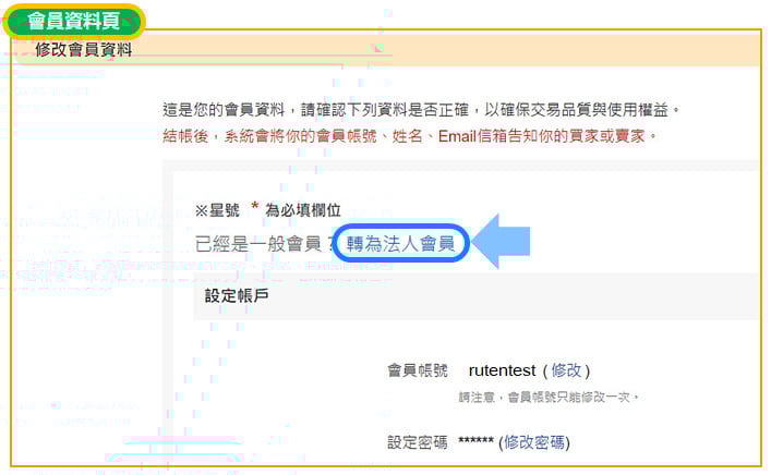 進入會員資料頁面後,請點選「轉為法人會員」選項。