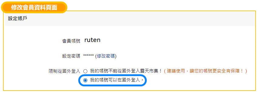 登入帳號後請至賣家中心>帳號>修改會員資料,將限制從國外登入欄位,勾選『我的帳號可以在國外登入』,修改後點選下方最下方「儲存設定」即可。