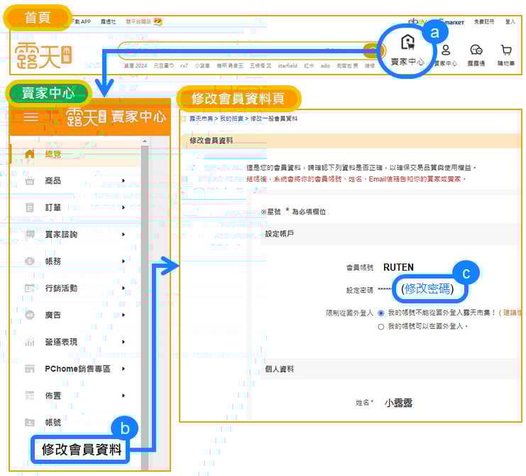 修改登入密碼操作方式 若欲變更會員登入密碼,請登入後至「賣家中心」>「帳號」>「修改會員資料」 ,點選設定帳戶欄位中之「修改密碼」,依序完成變更即可。(設定新密碼 需為 6 ~ 15 字元,至少搭配 1 個英文字母) 是否有回答到您的問題? +22 位使用者覺得有用 Loading...