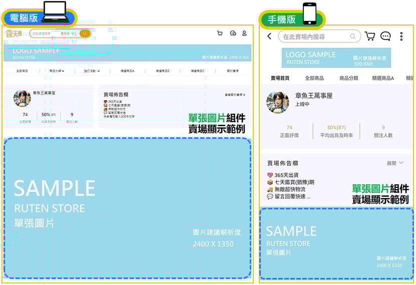電腦版:請登入後至「賣家中心」>「佈置」>「賣場佈置」。