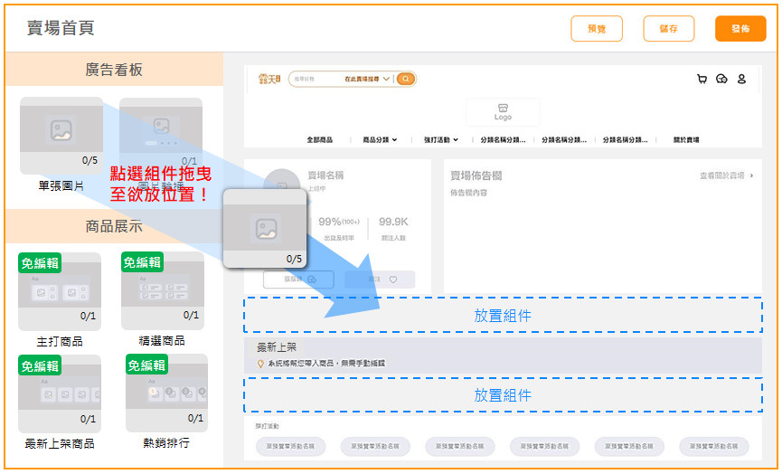請從左邊選單選擇將「單張圖片」組件直接拖曳至賣場首頁佈置編輯區即可新增。