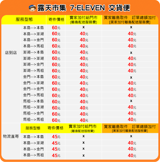 「露天市集‧7-ELEVEN 交貨便」服務為雙方共同合作,針對網路購物所推出的物流服務(檢視使用條款)。即日起,買家只要在提供「露天市集˙7-ELEVEN 交貨便」服務的賣場購買商品,便能輕鬆使用「 7-ELEVEN取貨」或「 7-ELEVEN取貨付款」服務。賣家也可享有更安全、更便利的物流配送服務、隨時掌握寄貨進度!
