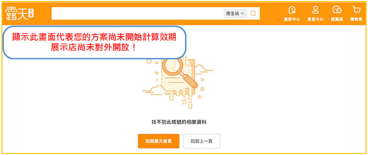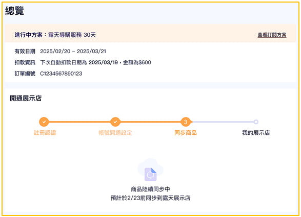 通過步驟一和二的認證與設定後,等待1~2天您的方案會開始計算效期,展示店開始對外開放。官網商品將陸續同步到露天展示店,完成同步時間依您官網的商品多寡約需要1 ~ 3 天。