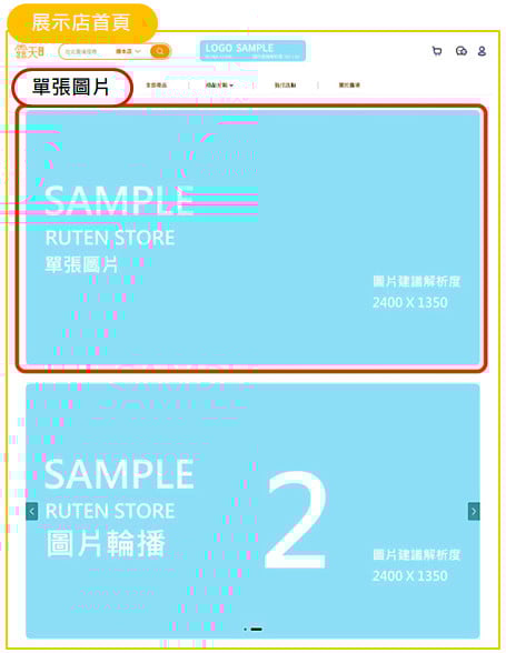 以下提供主力推薦版位說明,更多展示店首頁商品佈置功能請參考賣場佈置工具操作方式。