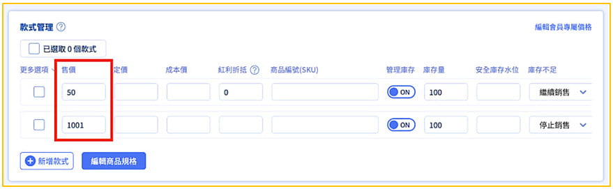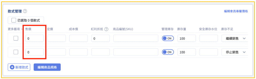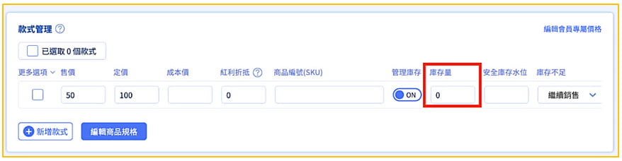 - 無庫存量:不論設定繼續銷售或停止銷售,只要庫存 ≤ 0 將無法在露天展示。