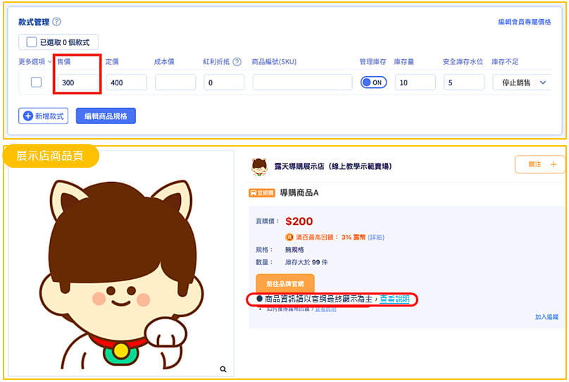 - 在展示店顯示的商品價格為「商品>所有商品」設定的「售價」,若另外設定折扣活動,目前露天展示店將不呈現,並提醒買家商品資訊「以官網最終顯示為準」。