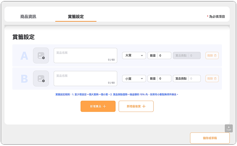 ※ 一套一番賞,至少需設定一個大賞與一個小賞,不一定要設定最終賞。