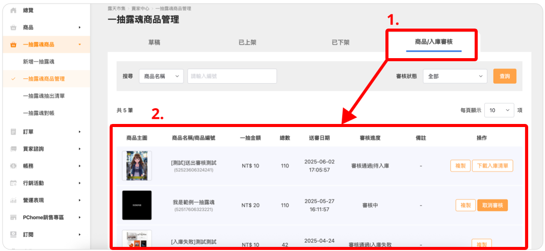 - 在【一抽露魂商品管理 – 商品/入庫審核】您可以查看所有審核進度,當審核進度狀態改變時,系統也會寄通知信到您的信箱。