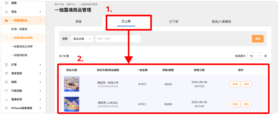 - 在【一抽露魂商品管理 – 已上架】,您可查看「正在上架中」及「即將銷售」之商品。