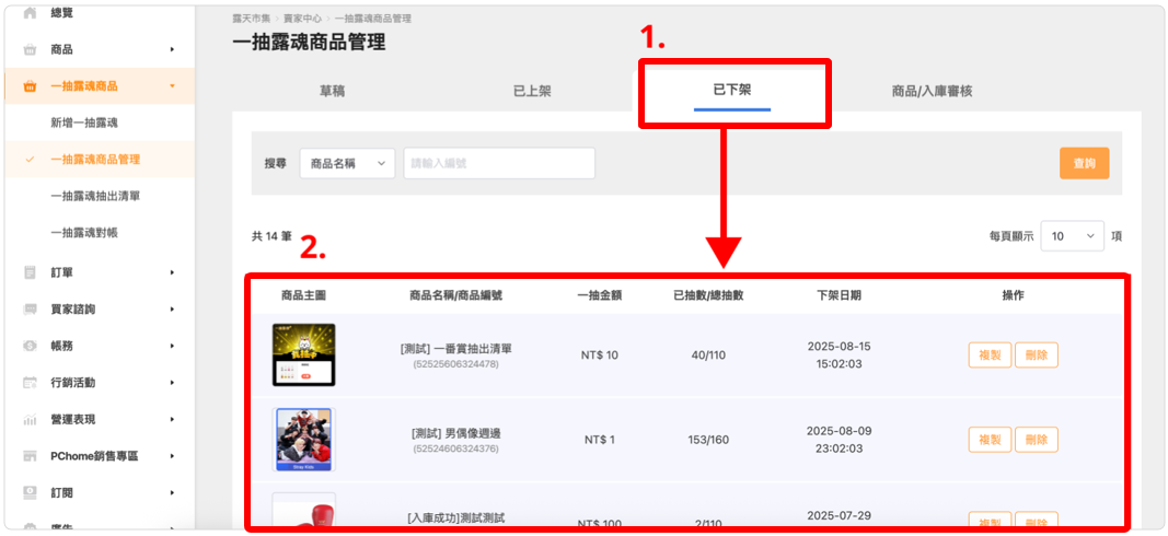 - 在【一抽露魂商品管理 – 已下架】,您可查看「已完抽」及「已終了」之商品。