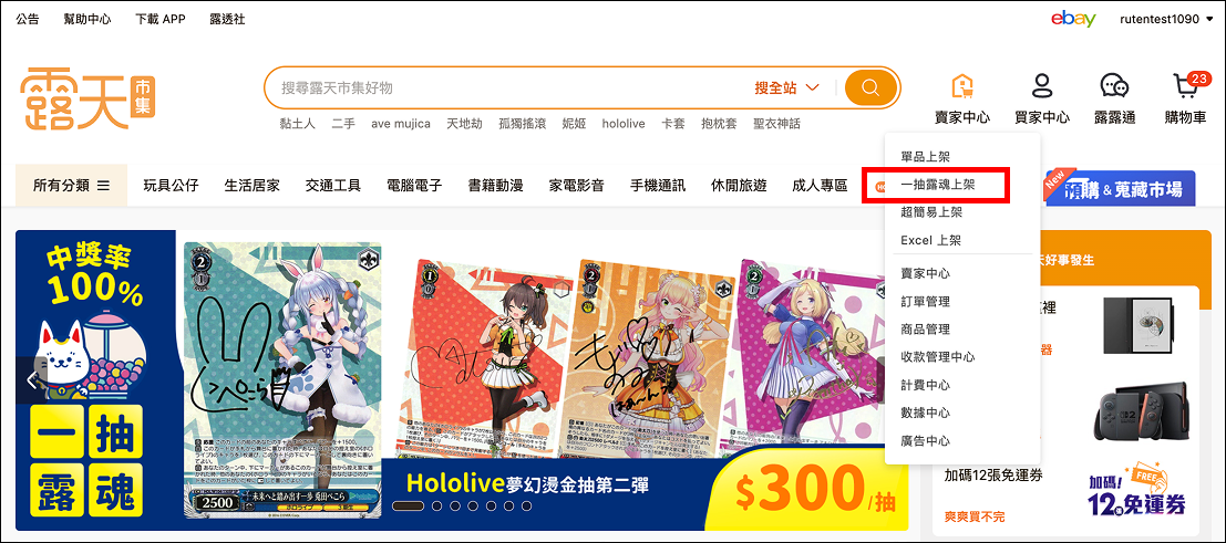 Step 1 – 請登入後點選首頁右上方【賣家中心】>【新增一抽露魂】