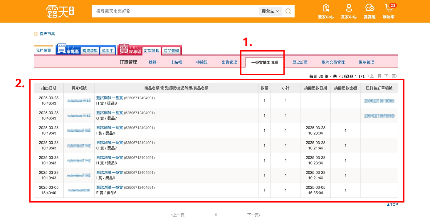 您可至【訂單管理 – 一番賞抽出清單】查看目前已被抽出的獎項,及消費者「換回點數」、「已打包訂單」的狀況。