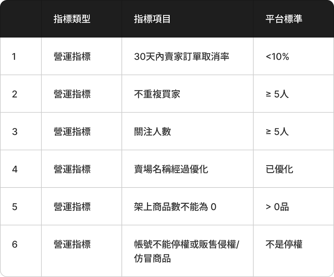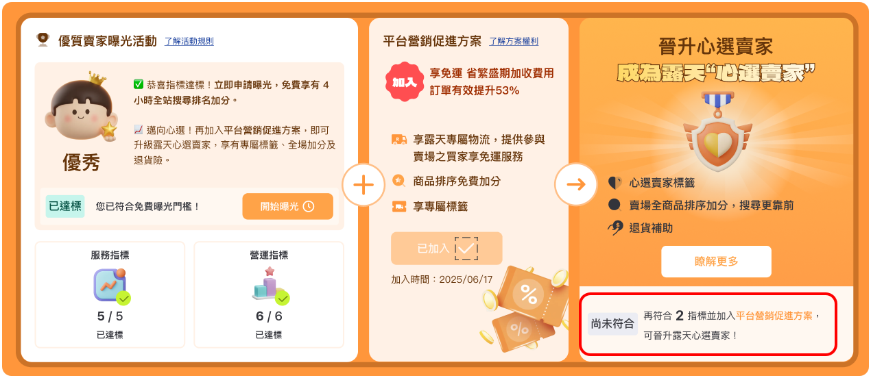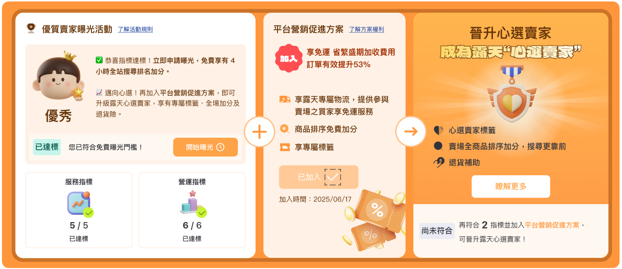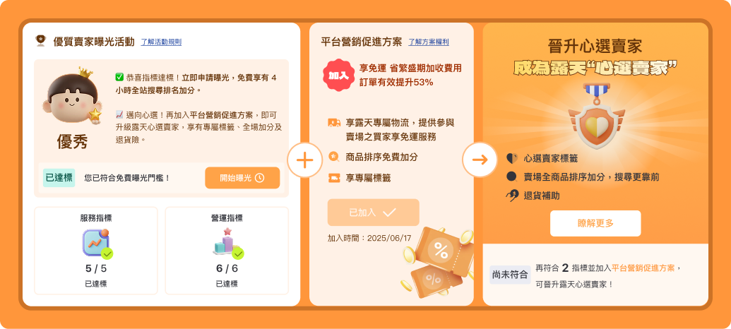 賣家須符合服務/營運各個指標,並加入平台營銷促進方案,即可晉升為心選賣家。(不需手動申請)