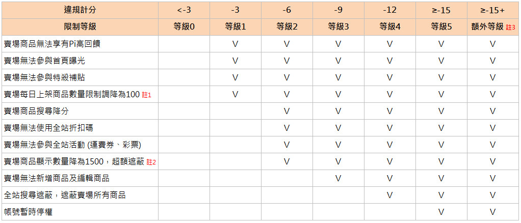 註2:賣家違規計分累積計分達 ≥ -6 分 ( 等級 2 ) 以上,賣場顯示及可被搜尋到之商品將限制為最多1500品,系統會在28天後自動解除限制,且將恢復原賣場商品顯示數量上限。