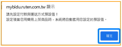 Step 2 – 若您看到視窗提示「請先設定付款與運送方式預設值」,表示您為第一次刊登商品需先完成相關您欲提供之付款及運送式,請按下【確定】送出前往設定。