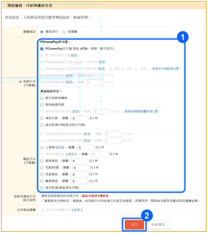 Step 3 – 進入預設運費、付款與運送方式頁面請自行選擇您可提供之「收款方式」「運送方式」,再點選【儲存】送出,完成設定後,再前往首頁右上方【賣東西】【超簡易上架】