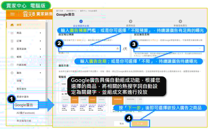 點選【賣家中心】>【廣告中心】> 【Google廣告】:點選後可直接進入設定介面及購買