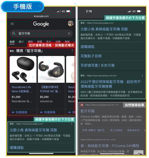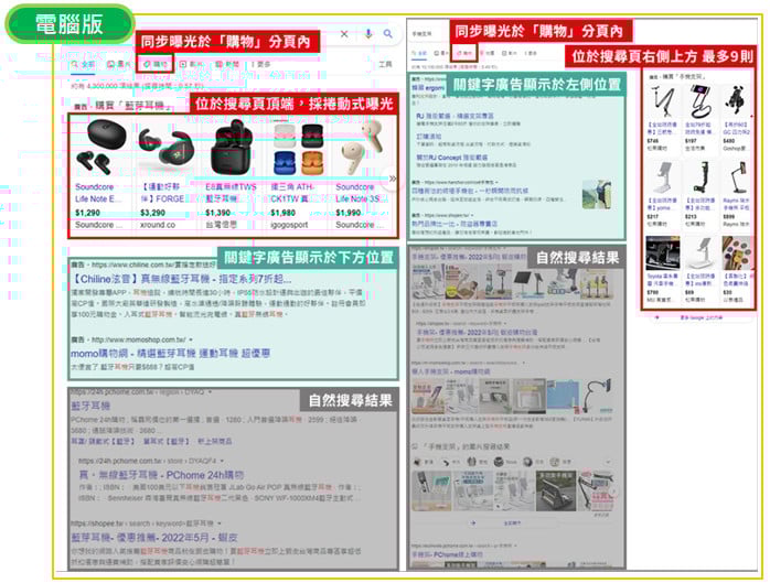 消費者只要透過Google搜尋到您的商品相關字詞,您的文字廣告就有機會顯示在搜尋結果任何一頁的上方。