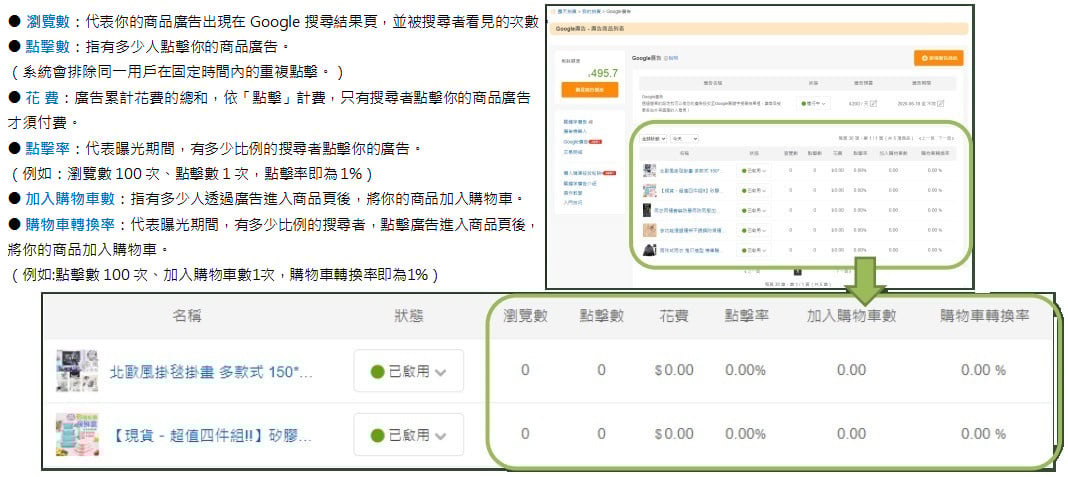 點選【賣家中心】>【廣告中心】> 【Google廣告】> 進入「廣告商品列表」,可觀察進行中商品的廣告表現。