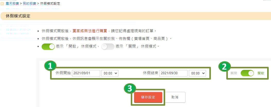 提醒您,休假模式開啟後,買家將無法下單賣場商品,賣家設定前,請務必將未完成的訂單處理完畢,以避免買家對您提出投訴。
