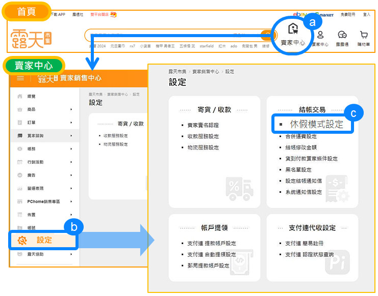 - 請登入後至賣家中心>設定>點選結帳交易欄位中【休假模式設定】。