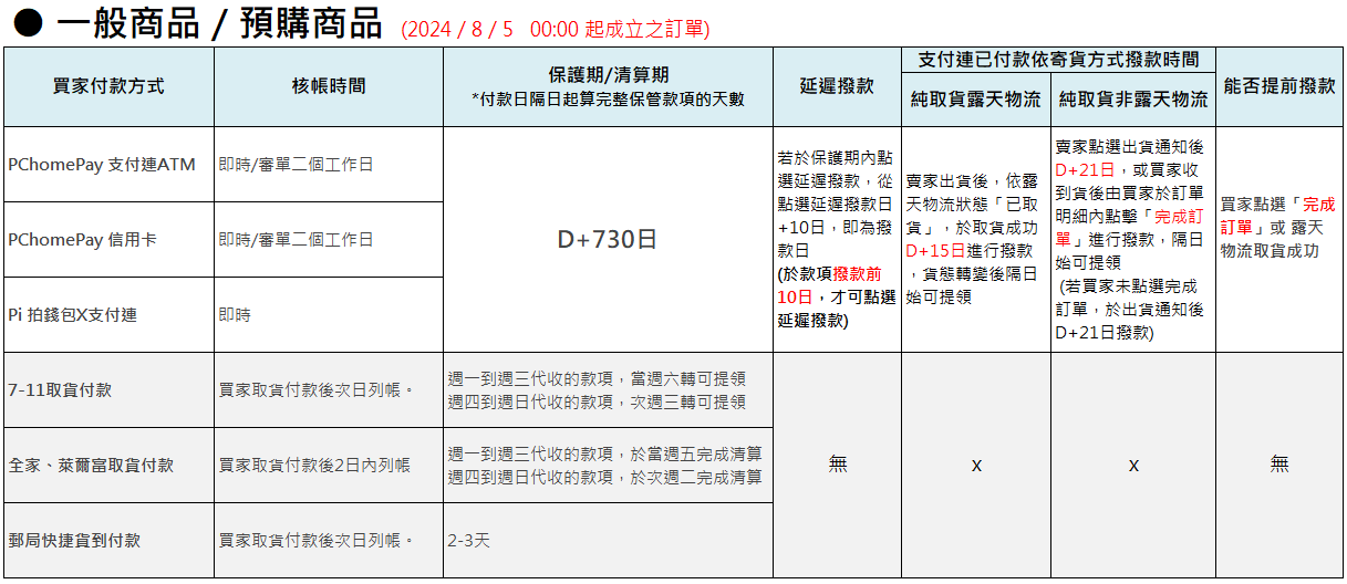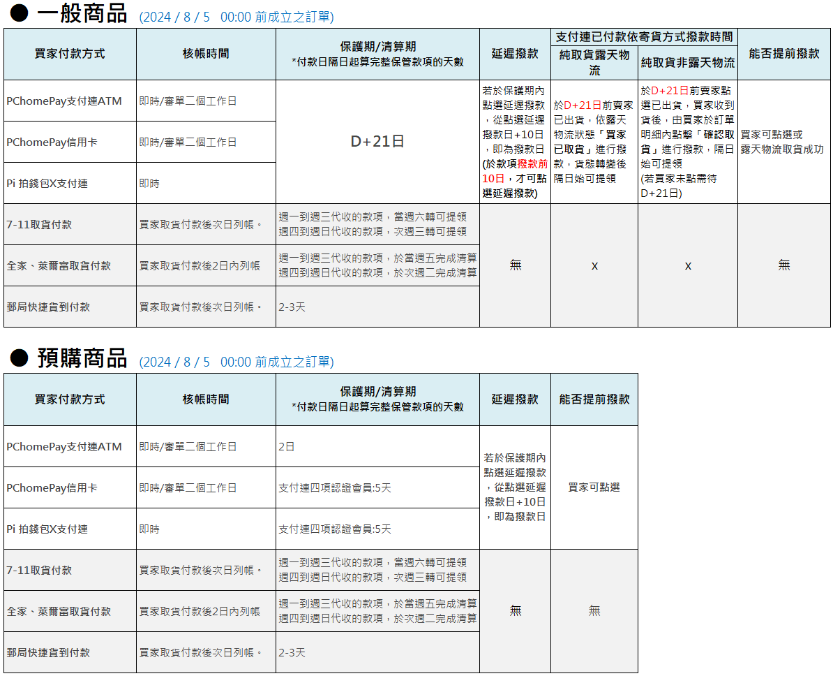 ● 買家於露天特約合作店家使用支付連信用卡、Pi錢包付款,保管期天數為21天;使用支付連ATM、銀行、餘額支付付款,保管期天數為15天。