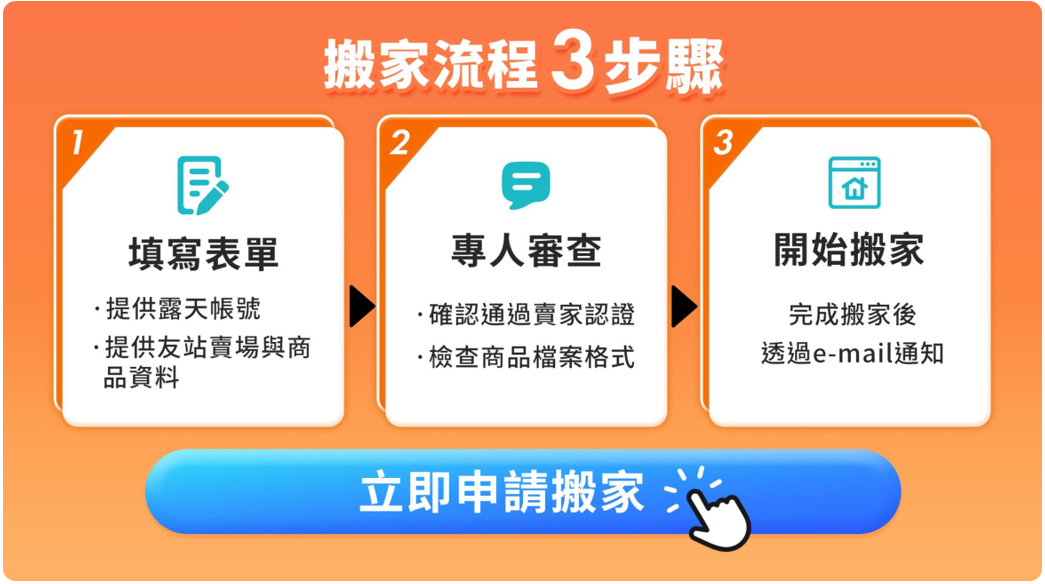 友站搬家申請說明 📢 露天 2025 推出新版「友站搬家」服務📢 搬家露天 3 步驟,目前支援蝦皮賣場📢 同時搭配最高「5折」新手流量禮包 幫你省$$ ┃ 搬家露天 3 步驟 ┃ 認識露天賣場分級 是否有回答到您的問題? +24 位使用者覺得有用 Loading...