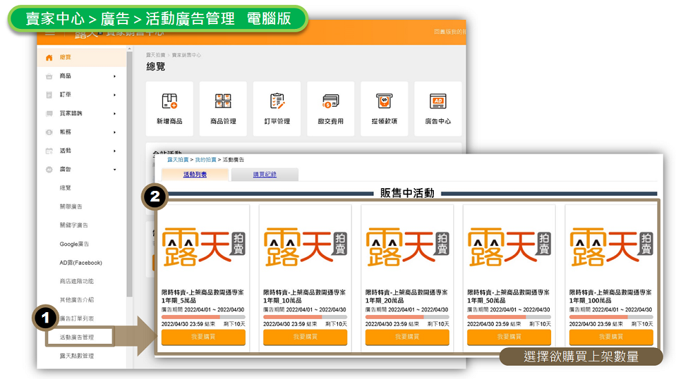 請至以下路徑 賣家中心>廣告>活動廣告管理  後,點選選擇欲購買上架數量之方案。