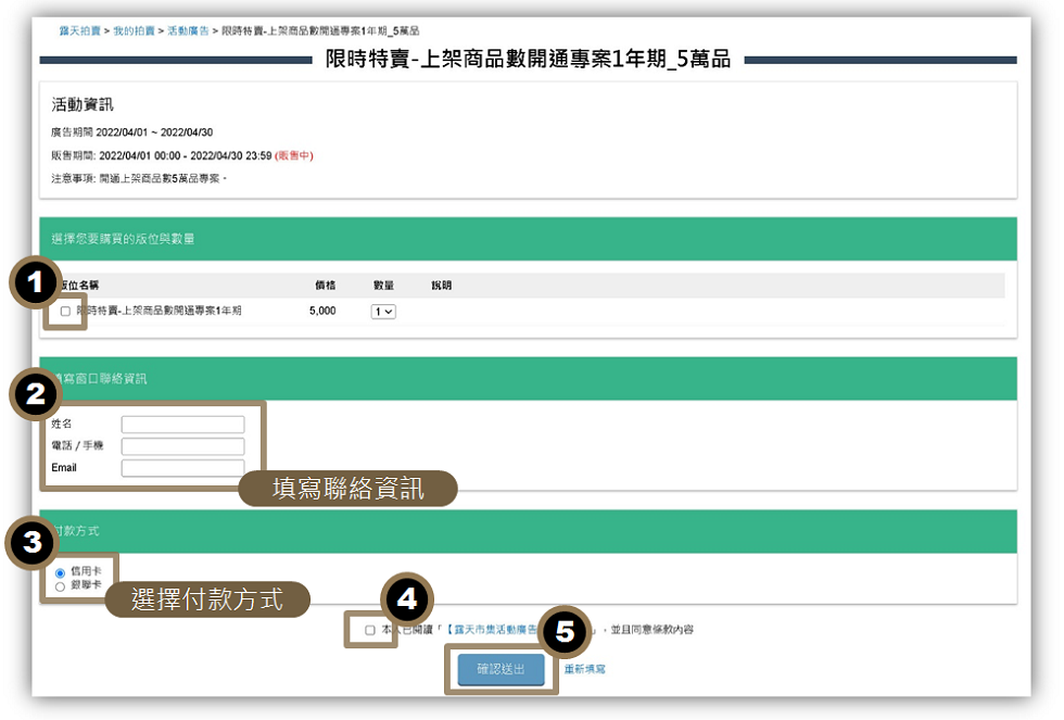 進入欲購買之活動資訊頁後,勾選欲購買方案,填寫聯絡資訊及勾選付款方式,再勾選已同意相關條款內容,按下「確認送出」,再依照說明完成付款即可。