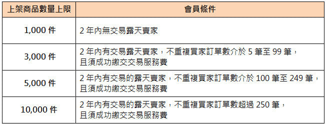如您賣場的上架商品數超出規範數量,有商品數量調整之需求,您可選擇以付費方式提升賣場商品數量。