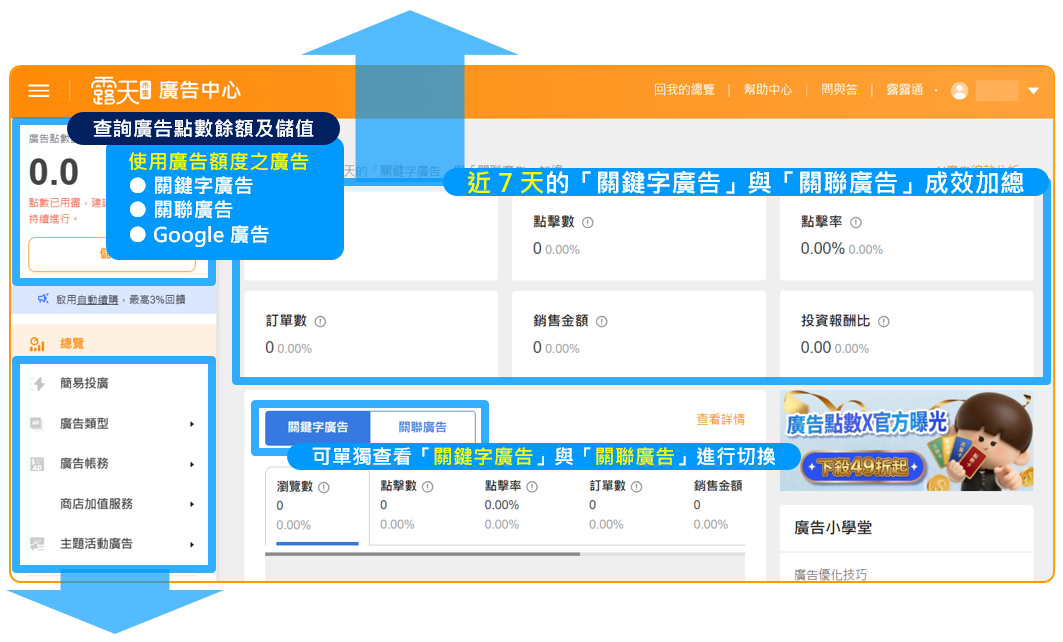 提供廣告餘額查詢及所有廣告購買設定入口匯整,另提供已購買「關鍵字廣告」與「關聯廣告」等分析數據,供賣家參考,協助賣家了解廣告投放成效,即時調整設定廣告。