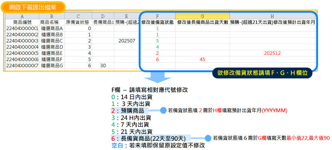 開啟下載檔案後,於「修改備貨狀態」( F 欄位) 依欲修改之備貨狀態填寫相對應代號。