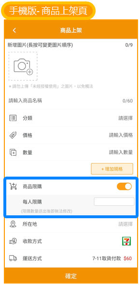 ※ 提醒您,商品刊登後限購數量即無法修改,僅能關閉限購,無法重新設定限購數量,欲調整限購數量,則需重新刊登商品。