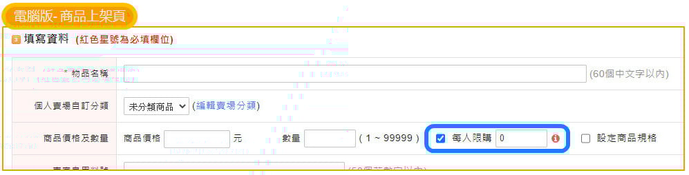 於刊登商品時,可於開啟【商品限購】欄位後,即可自行輸入設定每人限購數量。