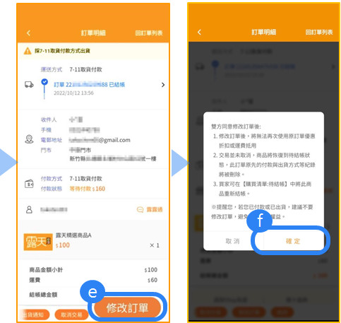若結帳訂單欲修改結帳內容,包含金額、品項、付款/取貨方式、收件人資料,交易雙方需透過「修改訂單」步驟。