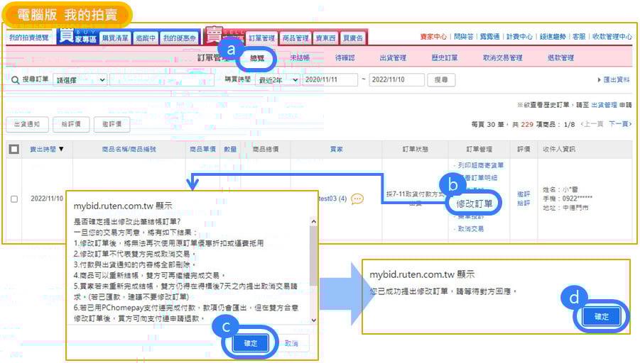 於【賣家專區-訂單管理】之「總覽」頁面中選擇欲修改之訂單請點選「修改訂單」,出現彈跳之說明視窗請點選「確定」。