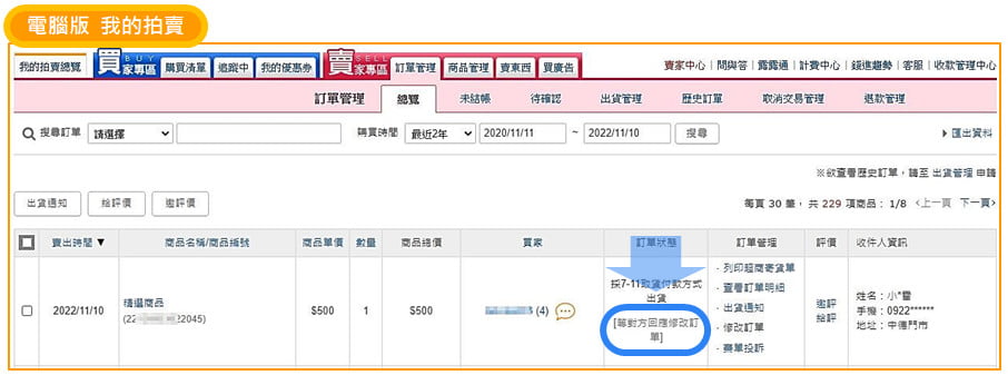 ● 若訂單狀態為「已出貨」即無法提出修改訂單。