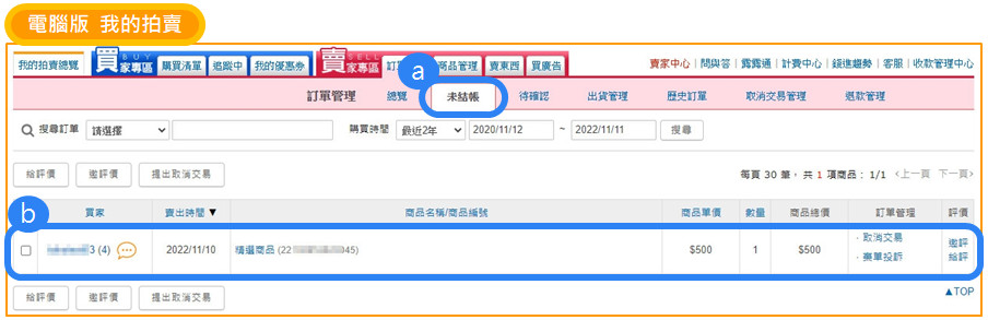 當交易方回應並同意修改訂單後,點選【我的】,點選「賣家訂單管理」>「未結帳」,看到此下單紀錄,即可通知買家重新進行結帳以利完成出貨相關事宜。