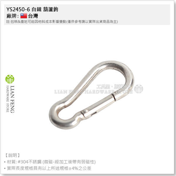 【工具屋】*含稅* YS2450-6 6mm 白鐵 葫蘆鉤 SUS304 登山鉤 接環 不鏽鋼 鑰匙圈 登山掛鉤 鉤扣