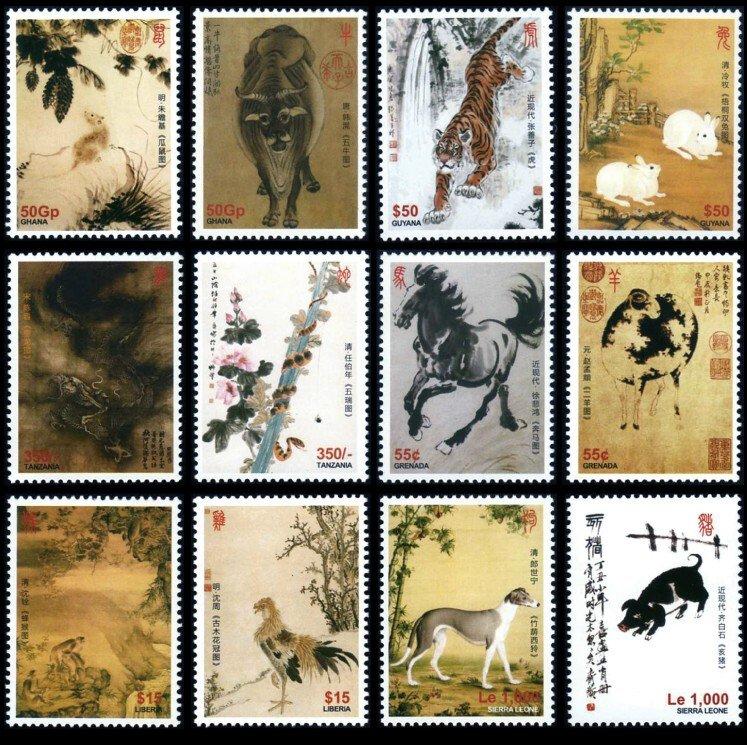 ●$--2013年---十二生肖名畫珍郵---六國合發---12 全--館藏國寶名畫郵票--$●