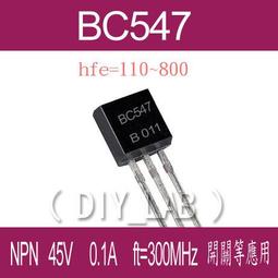 【DIY_LAB#589】(10個)電晶體 BC547 (TO-92) NPN 45V 300MHz 開關及放大(現貨)