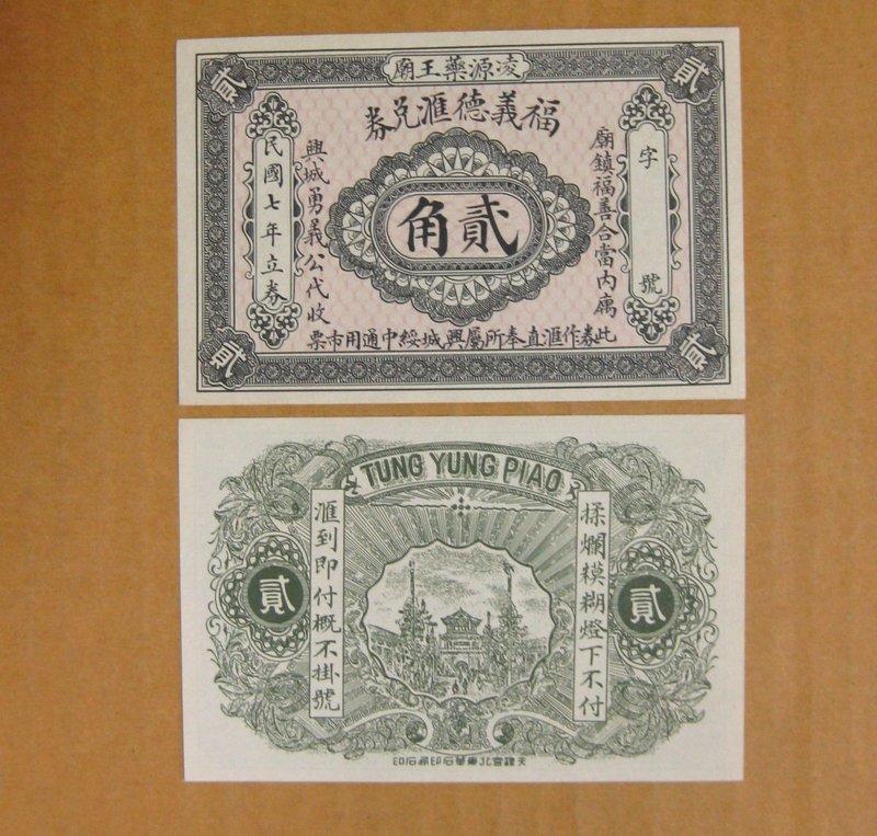 □■--少見地方錢莊票---民國七年---福義德匯兌券---貳角---□■-非常少見