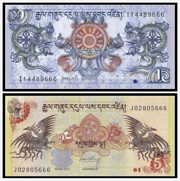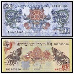 【亞洲】紙幣外幣龍鳳鈔 不丹1、5 努爾特魯姆 一對 收藏紙鈔