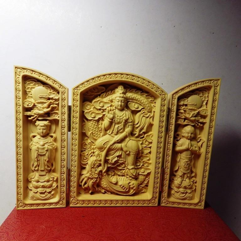 紫晶宮***精品隨身三合一佛龕 黃楊木騎龍觀音木雕佛像***盒子7公分*2.55公分*10公分.全開14.5公分