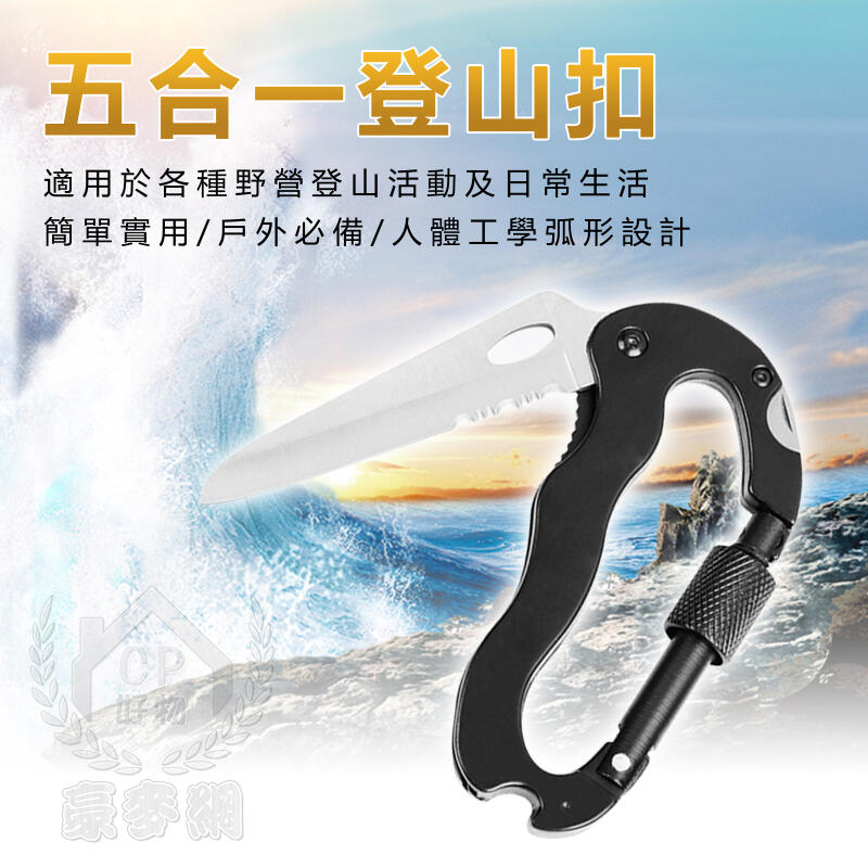 【五合一登山扣】登山露營戶外D型扣 帶鎖掛鉤 快掛扣環 鑰匙扣 小刀具 鋸齒 開罐器 十字 一字起子☆精品社