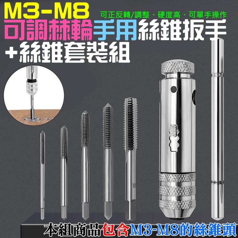 【台灣現貨】可調棘輪手用絲錐扳手 + 絲錐套裝組(M3-M8絲錐可用)#B01012E+#B01012F 攻牙器 攻絲器